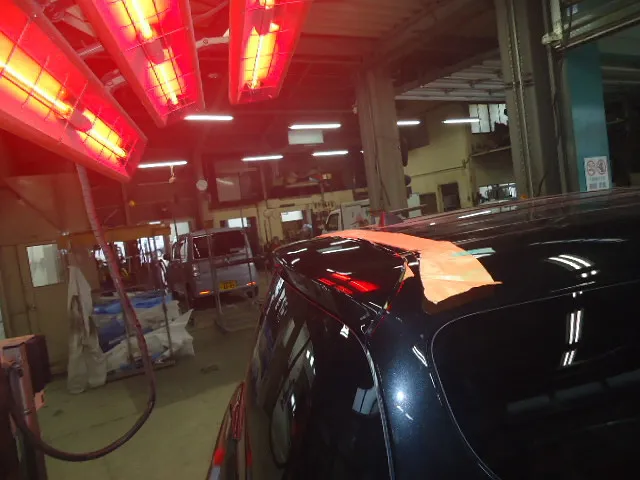 塗装ブース内で予備乾燥後、近赤外線乾燥機で本格乾燥したあと、塗面上のブツやごみを削り取り、コンパウンドで仕上げ磨き。