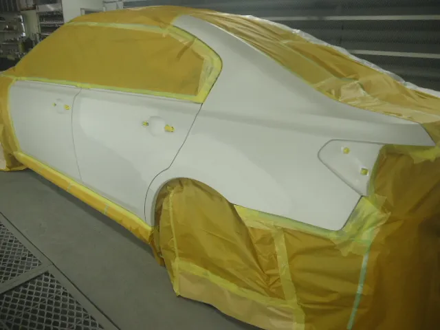 他の部位に塗料がかからない様に丁寧に養生してカラーベースの白色をまず塗装。少し時間をおき次にパールベースを塗装。最後に艶を出すためクリヤーという透明の樹脂を塗装をします。