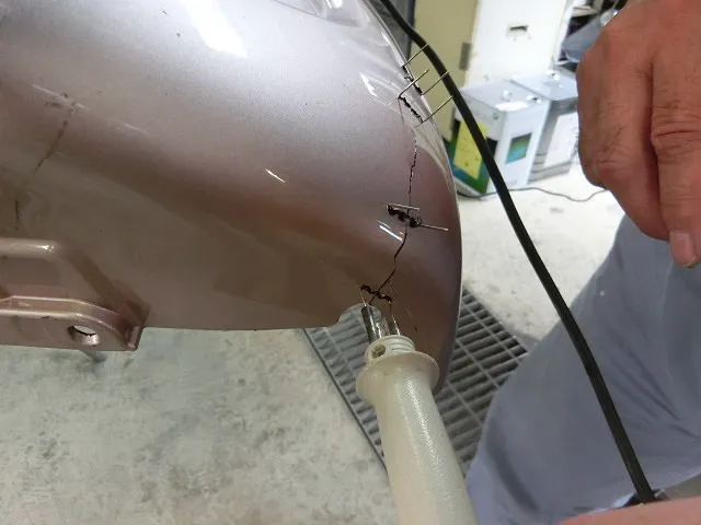 裂けた処を元の位置に合わせ溶殖ピンでとめていきます。