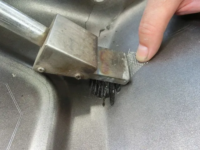 裏面を電気コテで溶かし金属メッシュを埋め込みます。