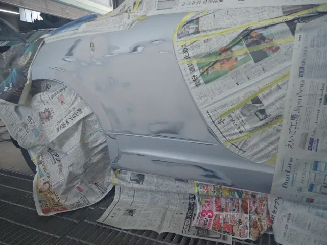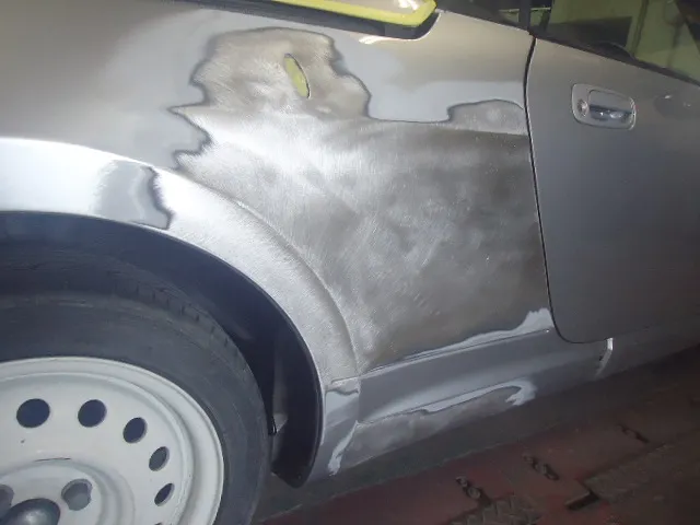 高粘度のポリエステル樹脂に硬化剤を混ぜて鈑金面にへら付け。10分位したらカチカチに固まります。温度が高いとすぐに固まってしまうので素早くへら付けしなければいけません。