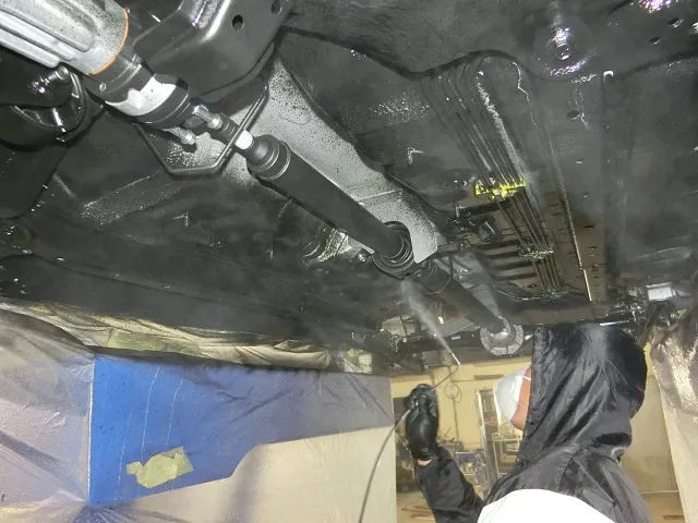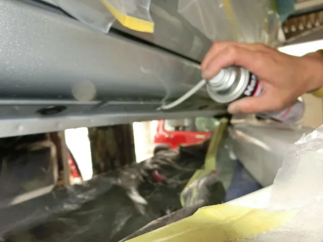 ドアー下部、ステップパネルの袋状になっているところにも液状の防錆剤を塗装します。